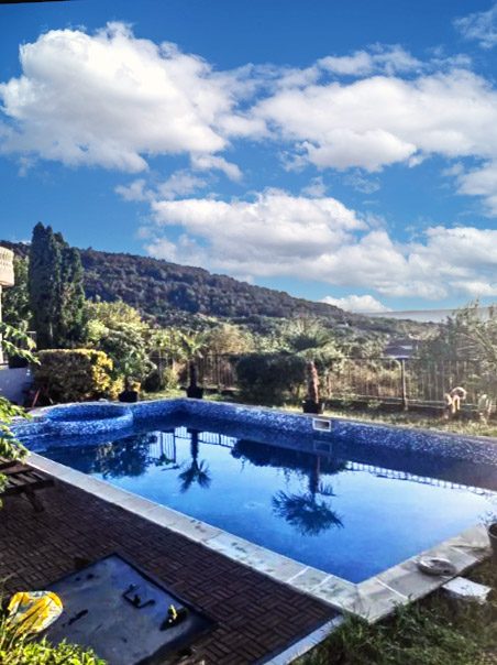 Covered garage and additional parking spaces, a huge swimming pool.