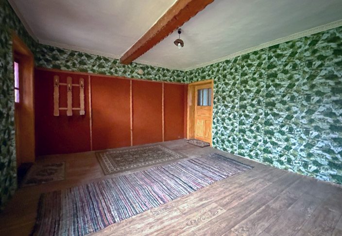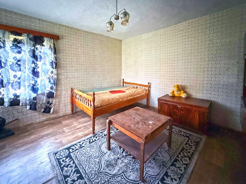 It consists of an entrance hall - 3 sqm, 4 large bedrooms of 16 sqm (one bedroom is transitional), bathroom and toilet - 4 sqm (in the process of renovation), L-shaped living room with kitchenette with built-in fireplace about 30 sqm + one room - 10 sqm (which is used for storage), second entrance / exit with access to a veranda and to the garden.