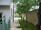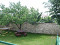 Yard in landscape style with a high fence / wall type/, with herbs, fruit trees and stone paths.